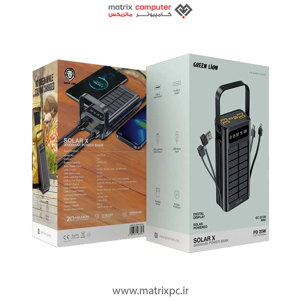 پاوربانک خورشیدی 30000 میلی آمپر گرین لاین Green Lion Solar X 30000mAh Power Bank PD 20W