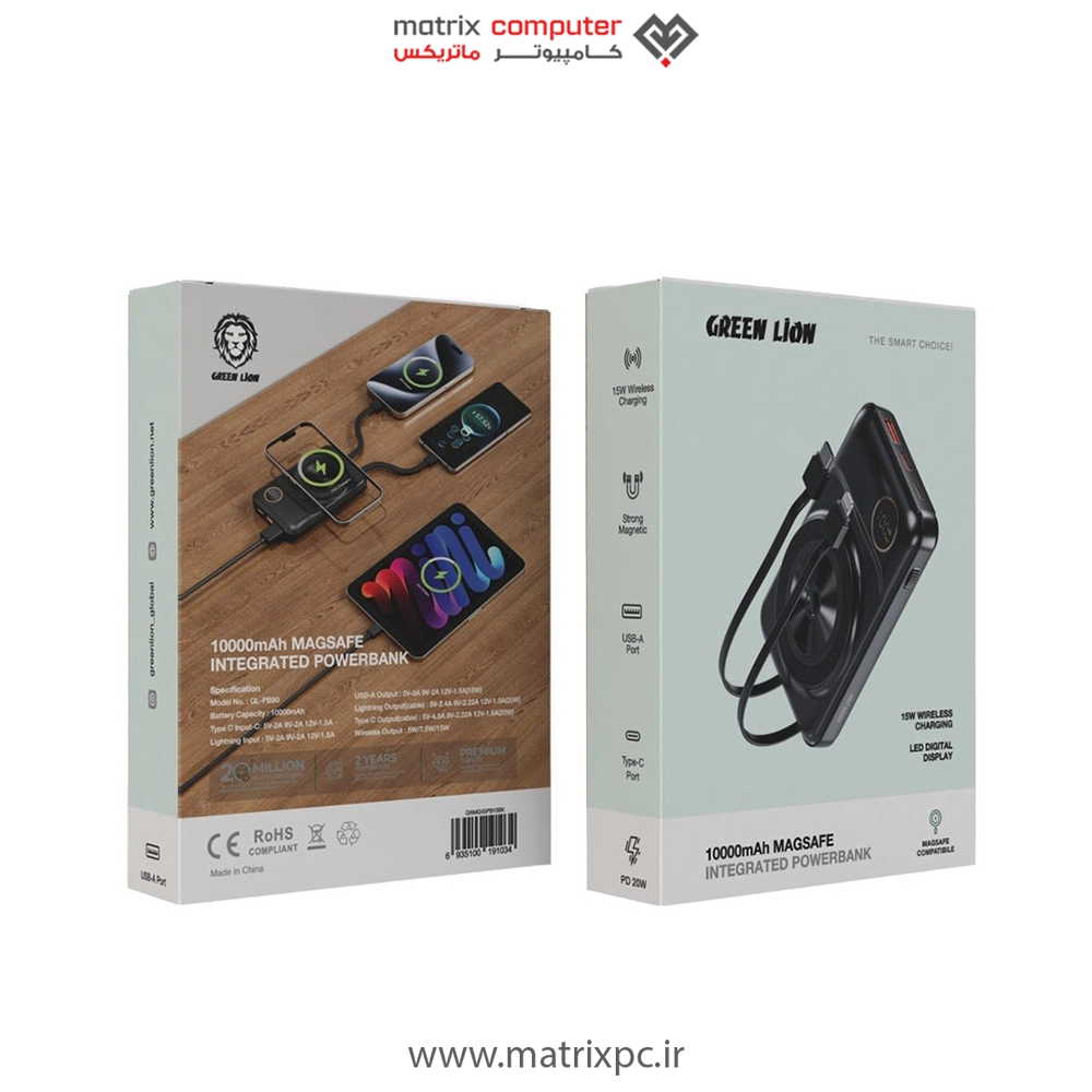 پاوربانک گرین لاین مدل Integrated ظرفیت 1۰۰۰۰ میلی آمپر ساعت